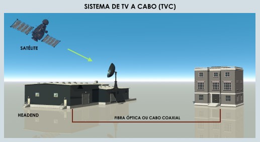 Cabo: O serviço TV a Cabo consiste na distribuição de sinais de vídeo e/ou áudio a assinantes, mediante transporte por meios físicos. No sistema de TV a Cabo (TVC) a programadora transmite o sinal por satélite até a central da operadora (headend), que envia a programação ao assinante por meio de cabo coaxial ou de fibra óptica (figura abaixo).