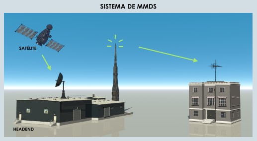 MMDS: O serviço de Distribuição de Sinais Multiponto Multicanais (MMDS) utiliza a faixa de microondas para transmitir sinais a serem recebidos em pontos determinados dentro da área de prestação do serviço. No sistema de MMDS a programadora transmite o sinal por satélite até a central da operadora (headend), que envia a programação ao assinante e este a recebe através de uma antena de microondas (figura abaixo).