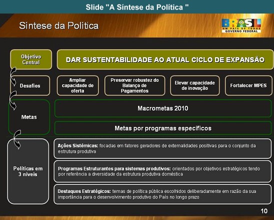 Finalmente, antes de ser apresentada a Síntese da Política, é mostrado um gráfico com a evolução recente da taxa de investimento no Brasil, e onde se sugere que o “Crescimento sustentado requer expansão do investimento à frente do crescimento do PIB”. A Síntese da Política propriamente dita é expressa na figura abaixo, onde se observa o Objetivo Central (Dar Sustentabilidade ao Atual Ciclo de Expansão), os Desafios (Ampliar capacidade de oferta; Preservar robustez do Balanço de Pagamentos; Elevar capacidade de inovação; e Fortalecer Micro, Pequenas e Médias Empresas), As Metas (sub-divididas em Macrometas para 2010 e Metas por programas específicos), e as Políticas em três níveis (Ações Sistêmicas, Programas Estruturantes para sistemas produtivos, e Destaques Estratégicos).