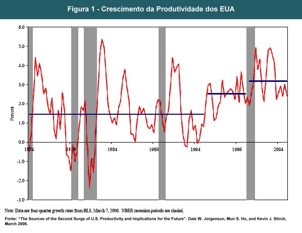 A Figura 1 à frente mostra dois surtos da produtividade ao plotar o crescimento da produtividade do trabalho no setor não-agrícola dos EUA (com base nos dados trimestrais e médias para três períodos mais longos) de 1973:Q4 (quarto trimestre) até 2005:Q4 (quatro trimestre). O crescimento anual da produtividade aumentou de 1,1 pontos percentuais depois de 1995, e daí aumentou mais 0,7 pontos percentuais depois de 2000.