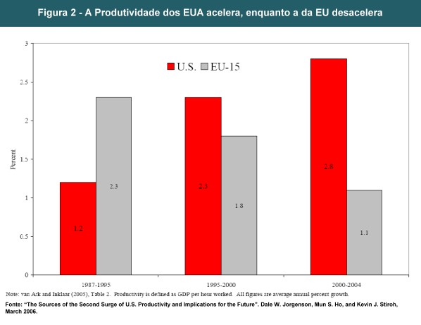 O aumento do investimento em TI nos EUA depois de 1995 tem contrapartidas em outras economias industrializadas. Estas economias também experimentaram um aumento no crescimento da produtividade nas indústrias produtoras de TI. No entanto, diferenças na importância relativa destas indústrias têm gerado amplas disparidades no impacto da TI no crescimento econômico. Entre os países do G7- Canadá, França, Alemanha, Itália, Japão, Reino Unido e EUA- o papel das indústrias produtoras de TI é maior nos EUA ([1]). A Figura 2 compara a experiência americana àquela da União Européia, medida pelo GDP (Gross Domestic Product, ou PIB) por hora, e mostra caminhos muito divergentes, à medida que a EU continuou lenta enquanto os EUA aceleraram.