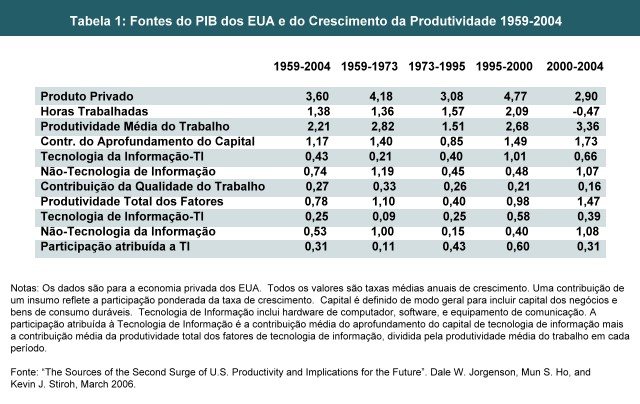 Em termos da produtividade dos EUA, pode-se chegar às seguintes principais conclusões. O primeiro surto depois de 1995 foi impulsionado por forças relacionadas a TI, como mostra a Tabela 1 à frente. A contribuição da Produtividade Total dos Fatores (PTF) de TI e o aprofundamento de Capital de TI, por exemplo, representaram juntos 60% do crescimento da produtividade de 1995 a 2000 (última linha da tabela, e cuja determinação é dada nas notas da mesma), e a maioria da aceleração quando 1995-2000 é comparado a 1973-1995. Em contraposição, estas duas forças representaram somente 30% do crescimento da produtividade de 2000 a 2004, e declinou em importância relativa depois de 2000. A aceleração da produtividade agregada depois de 2000 reflete outros fatores, tais como aprofundamento de capital não-TI e crescimento da PTF não-TI, ambos os quais aumentaram marcadamente.