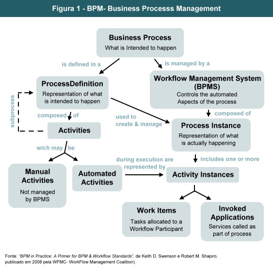 Em resumo, no enfoque BPM tudo se passa a partir do processo de negócio. Mas o que é um processo de negócio? Pela Figura 1 à frente, um Business Process é o que um negócio almeja fazer. Em certo senso, ele é a meta da organização, bem como o método pelo qual uma organização irá atingir aquela meta. Não se deve confundir, no entanto, o processo de negócio com os artefatos técnicos que dão suporte àquele processo. Uma Business Definition (definição de negócio) é a representação daquele processo de negócio, também conhecido como diagrama de processo ou modelo de processo. O restante da Figura 1 é auto-explicativo.