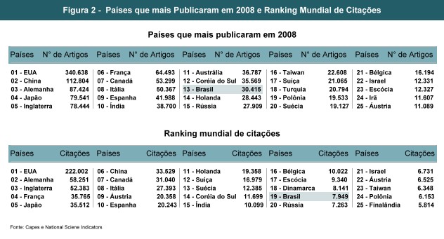 visto na Figura 1, que foi retirada de uma reportagem do jornal Valor Econômico, de 19/06/2009. Em 2008 o país passou para o 13º colocado no ranking dos países que mais publicaram trabalhos científicos (ver Figura 2, também do Valor Econômico), e hoje ocupa o 19º lugar no ranking mundial de citações científicas (Figura 2, também do Valor Econômico). Alguns especialistas têm apontado que o crescimento recente no número de artigos publicados não se deve a uma elevação da produtividade dos cientistas brasileiros, mas à ampliação do número de revistas e periódicos brasileiros indexados num dos principais mecanismos de registro de publicações científicas internacionais, que é o Web of Science.