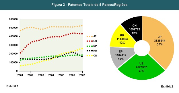 A questão, entretanto, que não quer se calar é a seguinte: este avanço científico tem se transformado em excelência e sucesso tecnológico, e comercial? A primeira resposta é um imediato NÃO! A excelência e o sucesso tecnológico são medidos através de vários indicadores. Um destes é o número de pedidos de patentes registradas em organismos internacionais de registro de patentes, ou no Instituto Nacional de Propriedade Intelectual- INPI. Outro indicador é o crescimento do número de empresas de base tecnológica. Observando o primeiro indicador, no cenário internacional de registro de patentes constatamos que daquelas patentes registradas no mundo 75% delas pertencem a apenas cinco países/regiões do planeta: EUA, Japão, Europa, Coréia do Sul, e China, e de todas estas registradas, 74% das patentes que foram concedidas vêm destas mesmas regiões ((ver Figura 3, retirada do documento “Patented in China: The Present and Future State of Innovation in China”, Thompson Reuters, 2009). Ou seja, o Brasil está no bolo dos 25% restantes.