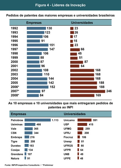 Quando se observa o cenário nacional, os números não são nada alvissareiros. E o problema maior se deve ao fato de que os patenteadores principais no Brasil não são as empresas, e sim as universidades. Como apontado recentemente pelo jornal Valor Econômico, divulgando uma pesquisa da empresa Prospectiva Consultoria, as grandes universidades do país ultrapassaram um dezena de tradicionais empresas inovadoras e hoje são responsáveis pela maioria dos pedidos de patentes para novos produtos no Brasil. Entre 2001 e 2008, as maiores universidades protocolaram 1.359 pedidos junto ao INPI, superando os 933 pedidos das dez empresas que mais inovam (ver Figura 4, do jornal Valor Online de 12/06/2009).
