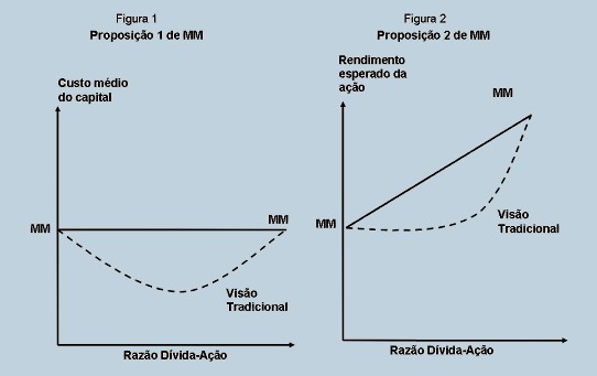 Os Profs. Modigliani e Miller colocaram esta visão “de cabeça para baixo”. Suponha que investidores pudessem emprestar ou tomar emprestado, grosseiramente, às mesmas taxas de juros que as empresas. Então imagine duas empresas, A e B. A primeira, A, não tem dívida; e lança 1000 ações a R$ 1,00 cada, logo tem um valor de R$ 1.000,00. A outra empresa, B, é idêntica em todos os respeitos, exceto que ela é alavancada, isto é, tem dívidas. Ela levantou R$ 500,00 em dívidas e R$ 500,00 em ações. Estas ações custariam R$ 1,00? Não, na visão convencional. A empresa alavancada, B, teria um custo de capital menor que a não alavancada, A, e, portanto, valeria mais. O preço da ação da empresa alavancada, B, excederia R$ 1,00, e poderia valer mais de R$ 1.000,00.