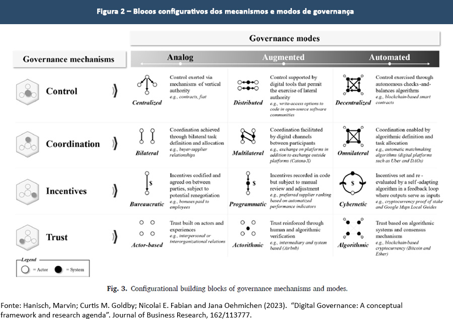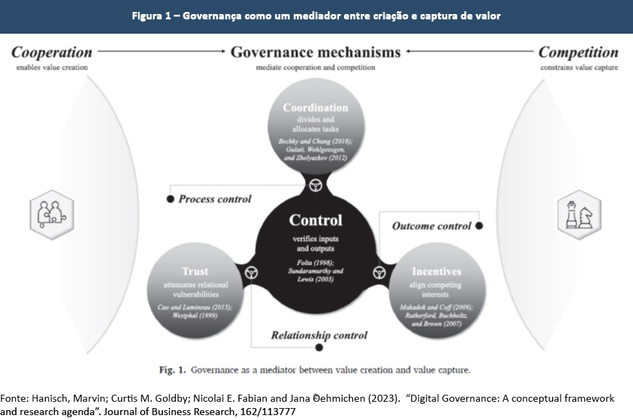 Foi pensando em todos estes aspectos, que Marvin Hanisch, Curtis M. Goldsby, Nicolai E. Fabian e Jana Oehmichen publicaram neste ano, no Journal of Business Research o artigo intitulado “Digital governance: A conceptual framework and research agenda” (Governança Digital: Um arcabouço conceitual e agenda de pesquisa). Neste artigo os autores desenvolvem um arcabouço conceitual que distingue as formas de governança analógica, aumentada e automatizada de controle, coordenação, incentivos e confiança.