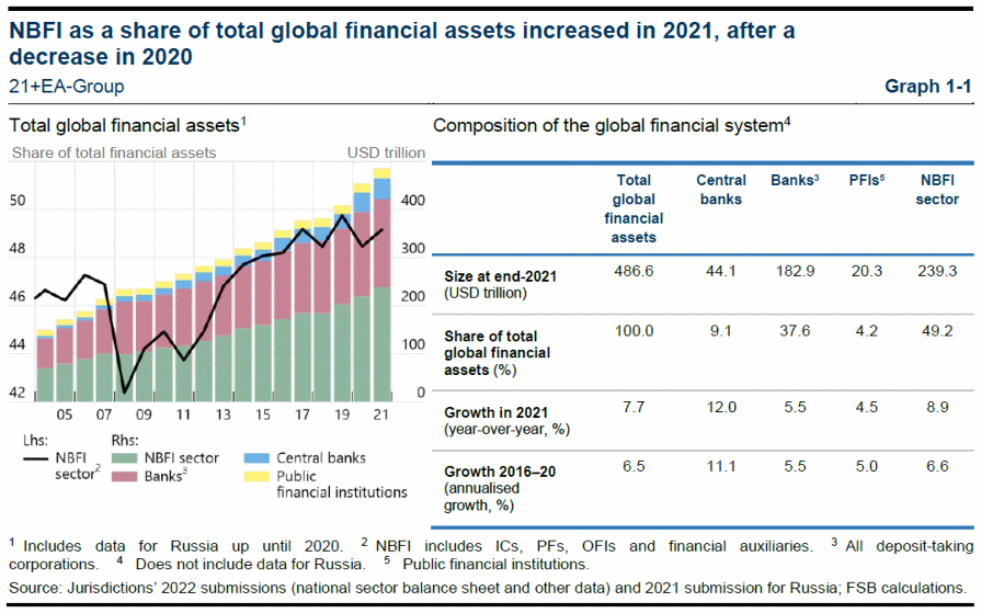 Em um de seus mais recentes relatórios, o FSB avaliou as tendências globais no “non-bank financial intermediation sector” – NBFI (setor de intermediação financeira não bancária), como foi reconhecido o shadow banking, para o ano de 2021, cobrindo 29 jurisdições que representam 80% do PIB global. Segundo o FSB o setor NBFI cresceu 8,9%, um crescimento maior do que seu crescimento médio de cinco anos de 6,6%, sua participação nos ativos financeiros globais ficou estável, em 49,2%, perfazendo um total de US 239,3 trilhões, como apontado na Figura 1 a seguir.