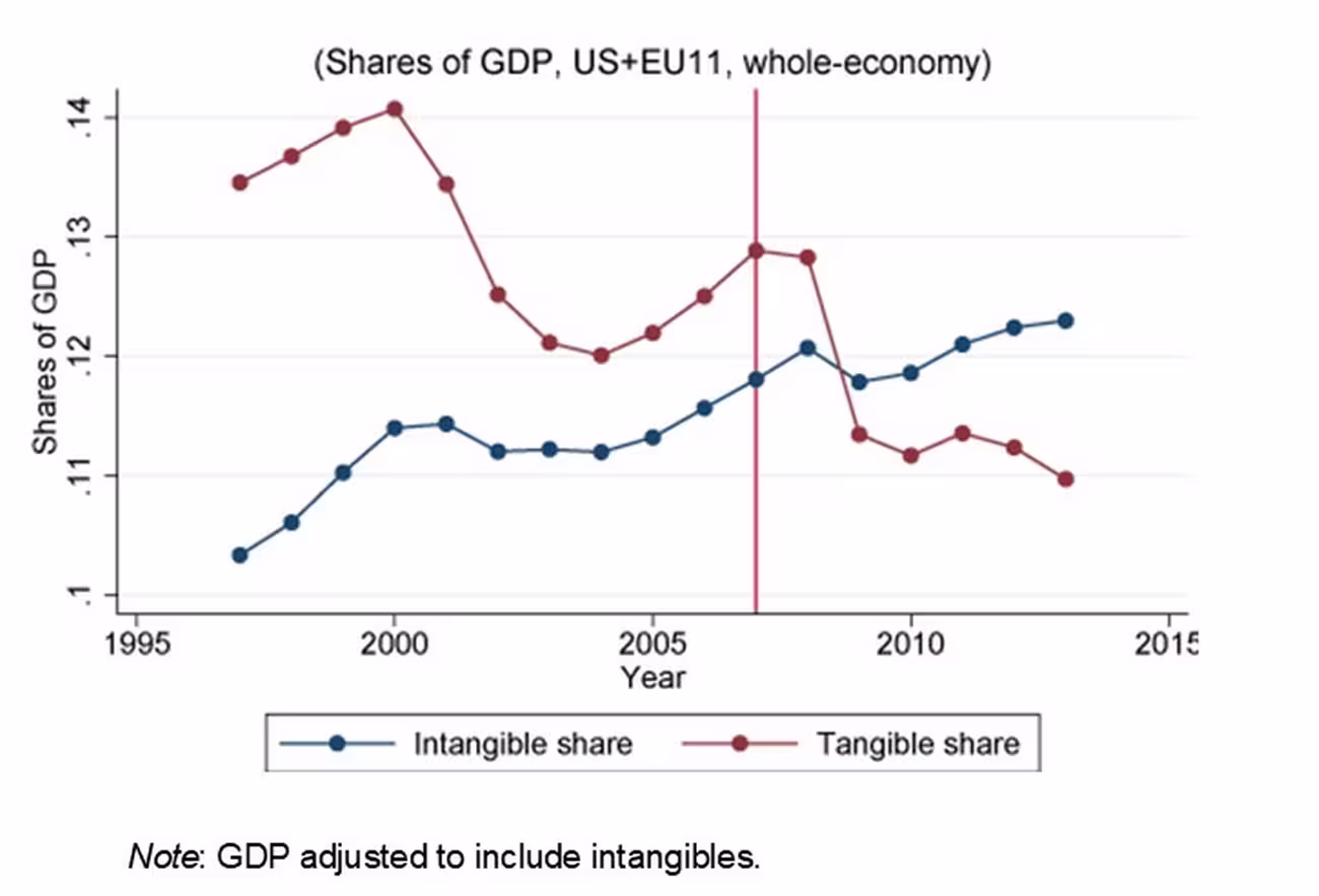 Mas será que nas atuais Economia e Sociedade Digitais estes meios/fatores de produção clássicos são ainda preponderantes? Nós não podemos ignorar a importância de tais fatores, mas se colocarmos numa escala de importância, estes meios, que têm característica de tangibilidade estão perdendo posição para os chamados “ativos intangíveis”. Basta uma rápida observação da Figura 5 à frente para constatarmos esta mudança de percepção, a partir da superação da produtividade dos investimentos intangíveis, como participação no PIB, em relação à produtividade dos investimentos tangíveis.